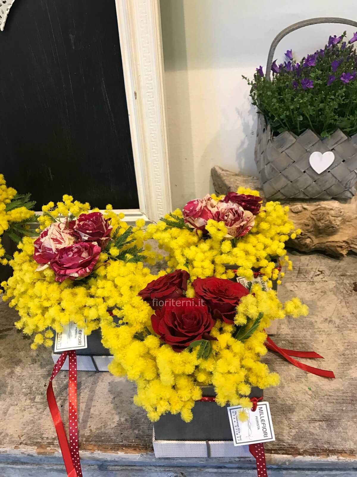| scatola di mimosa e rose cod. 73693 | Importo € 25,00 | Num. steli : |